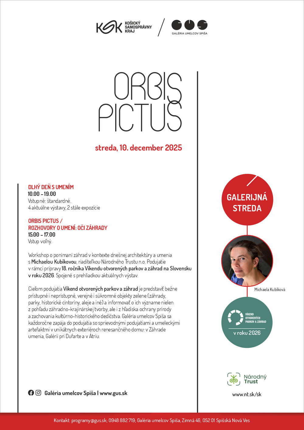 10. 12. 2025, streda / 15.00 – 17.00 / ORBIS PICTUS / ROZHOVORY O UMENÍ: Oči záhrady. Vstup voľný. Workshop o ponímaní záhrad v kontexte dnešnej architektúry a umenia s Michaelou Kubíkovou, riaditeľkou Národného Trustu n.o. Podujatie v rámci prípravy 18. ročníka Víkendu otvorených parkov a záhrad na Slovensku v roku 2026.