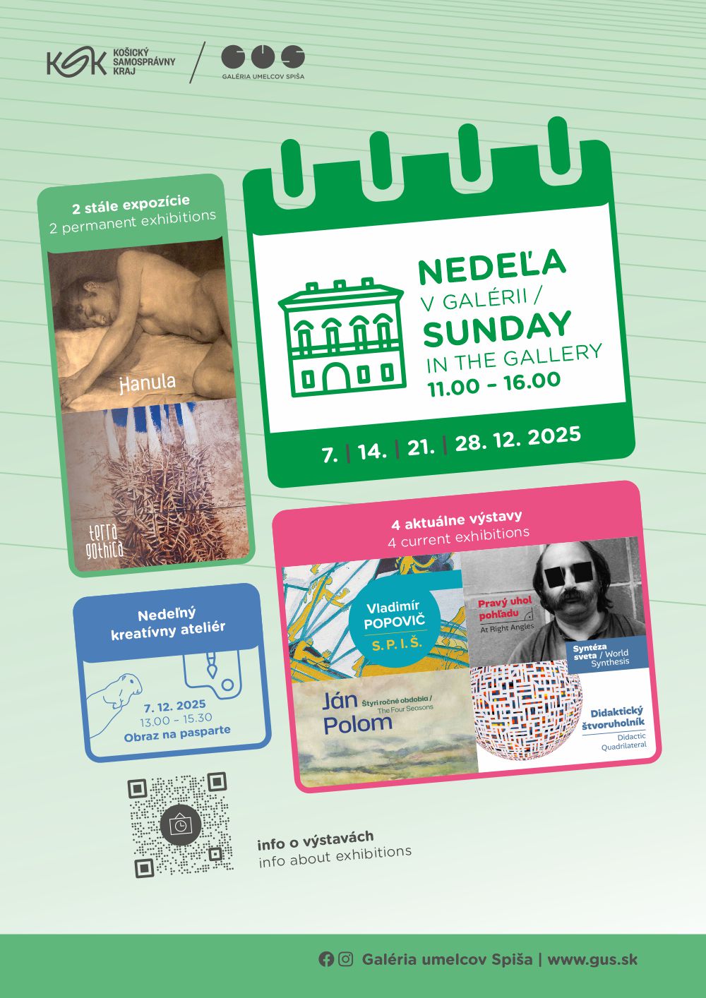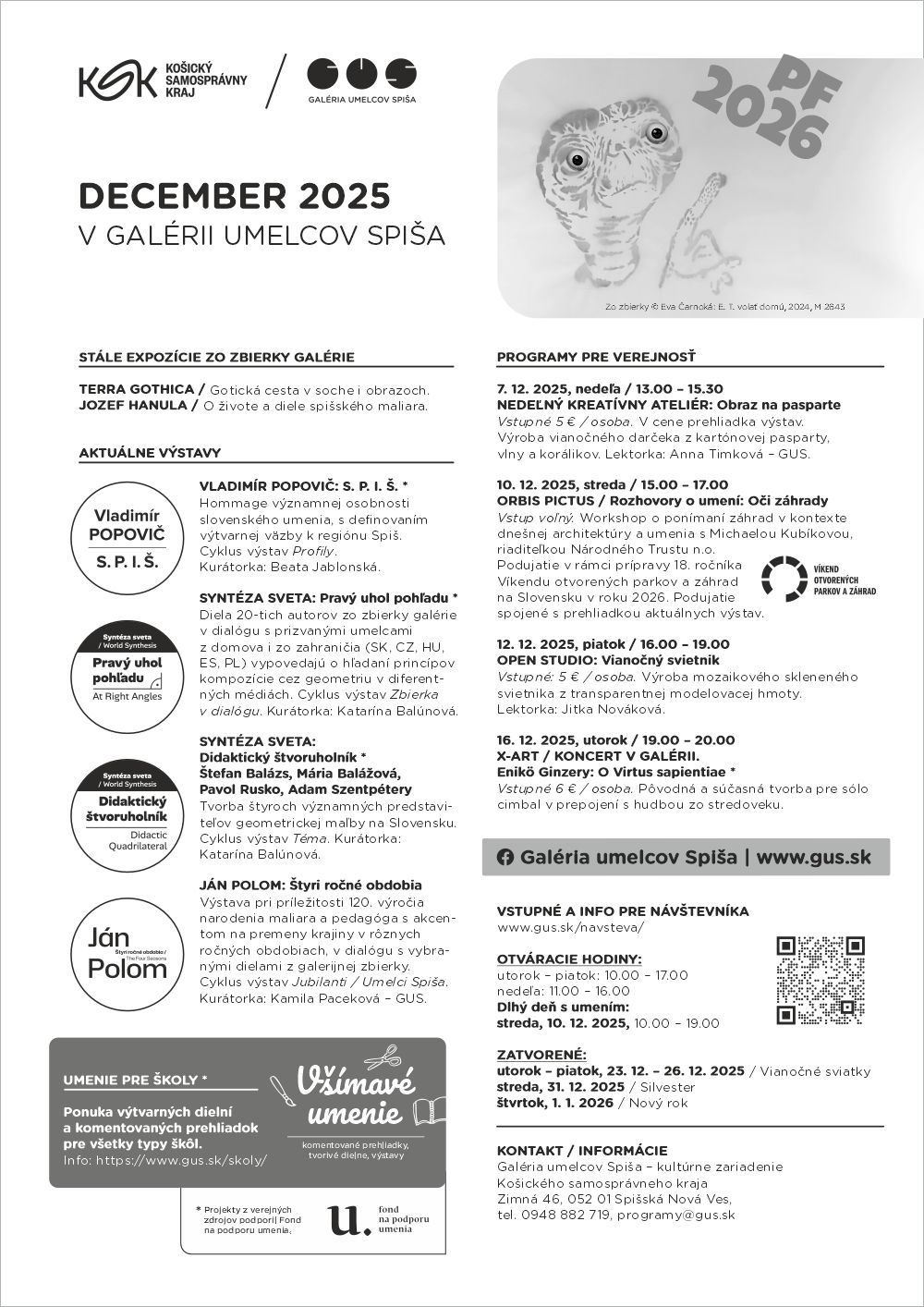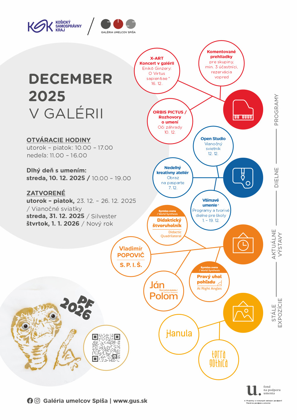 Galéria umelcov Spiša, kultúrne zariadenie Košického samosprávneho kraja, pripravila v poslednom kalendárnom mesiaci programovú ponuku orientovanú k prichádzajúcim vianočným sviatkom. Prvá decembrová nedeľa bude patriť obľúbenému programu Nedeľný kreatívny ateliér: Obraz na pasparte, ktorý je určený pre jednotlivcov i rodiny s deťmi. Originálne mozaikové vianočné svietniky si vytvoria účastníci dielne Open Studio. V rámci odborného fóra Orbis Pictus / Rozhovory o umení uvedieme workshop Oči záhrady, ktorý predstaví priority Víkendu otvorených parkov a záhrad v roku 2026. Týždeň pred Vianocami je pripravené posledné inštrumentálne vystúpenie v rámci projektu X-ART / Koncert v galérii. Súčasnú tvorbu pre sólo cimbal odohrá úspešná svetovo uznávaná cimbalistka Enikő Ginzery. Edukačné koncepty Všímavé umenie/Umenie pre školy určené pre všetky typy škôl budú prebiehať do 19. 12. 2025.
