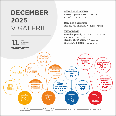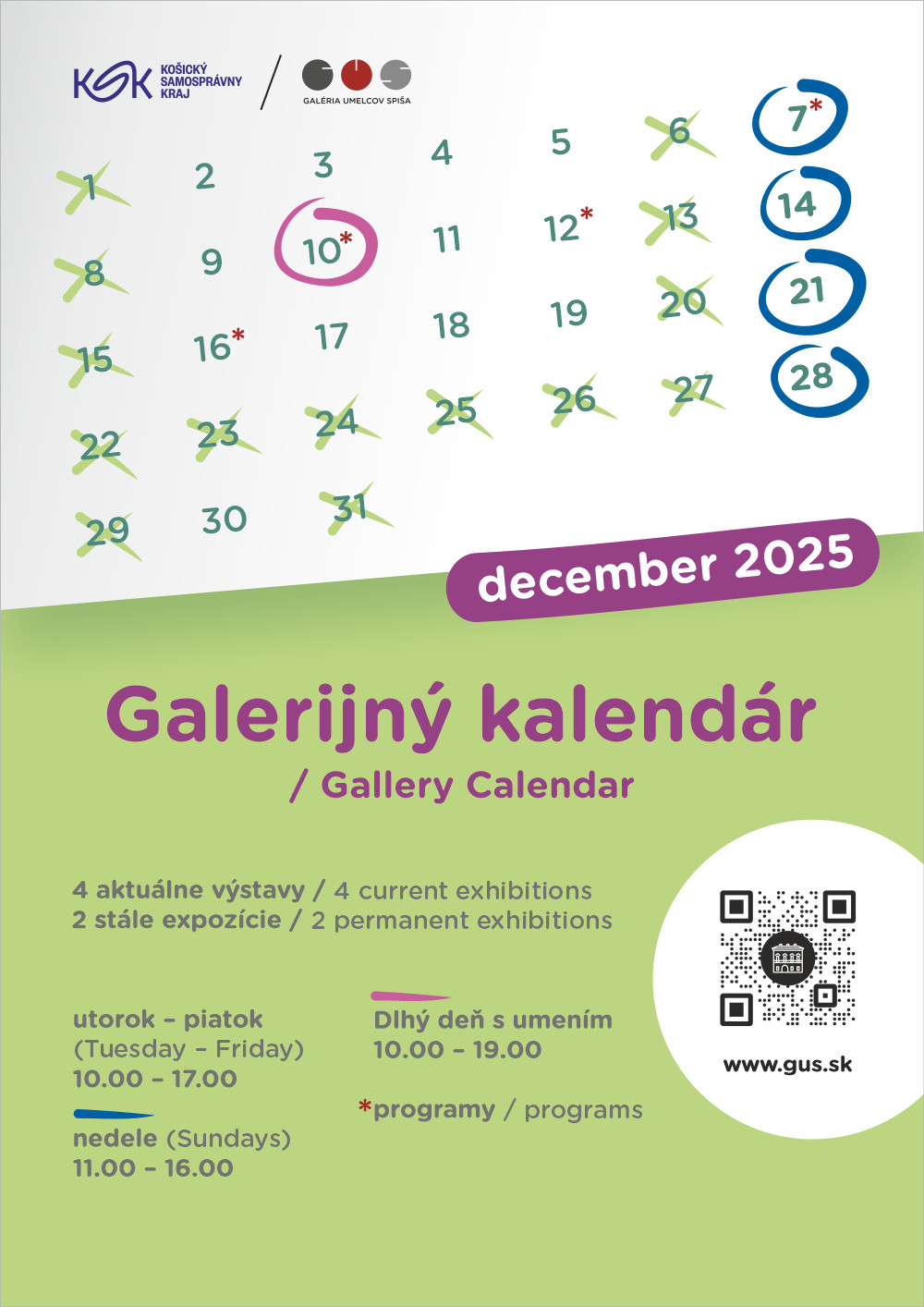 Galéria umelcov Spiša je v decembri pre verejnosť otvorená: utorok – piatok, 10.00 – 17.00 a nedeľa, 11.00 – 16.00. V stredu, 10. 12. počas Dlhého dňa s umením, bude galéria otvorená 10.00 – 19.00. Galéria bude zatvorená počas sviatkov utorok – piatok, 23. 12. – 26. 12.; v stredu, 31. 12. 2025 / Silvester a na Nový rok vo štvrtok, 1. 1. 2026.