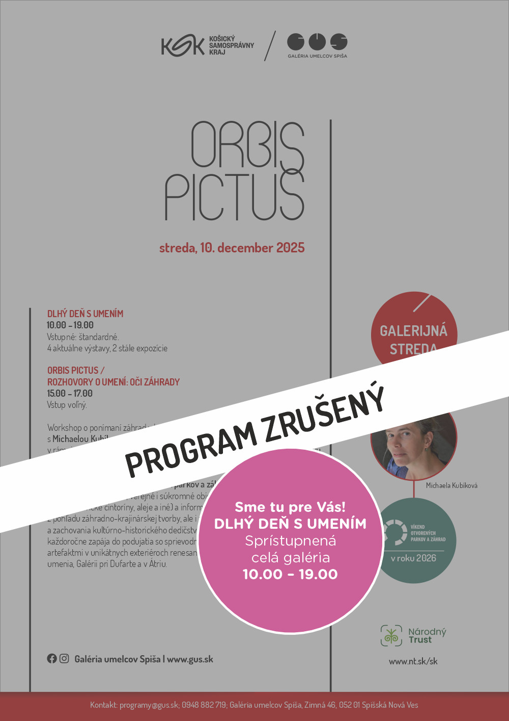 10. 12. 2025, streda / 15.00 – 17.00 / ORBIS PICTUS / ROZHOVORY O UMENÍ: Oči záhrady. Vstup voľný. Workshop o ponímaní záhrad v kontexte dnešnej architektúry a umenia s Michaelou Kubíkovou, riaditeľkou Národného Trustu n.o. Podujatie v rámci prípravy 18. ročníka Víkendu otvorených parkov a záhrad na Slovensku v roku 2026.