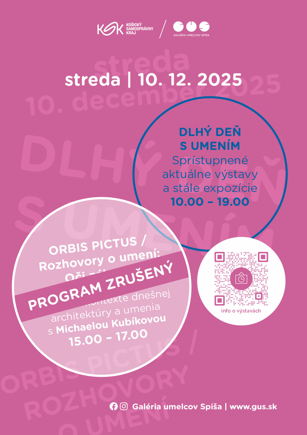 DLHÝ DEŇ S UMENÍM v čase 10.00 – 19.00 realizuje galéria pravidelne niekoľkokrát v mesiaci za účelom sprístupniť stále expozície a aktuálne výstavy verejnosti do neskorých večerných hodín. Vstupné: štandardné.