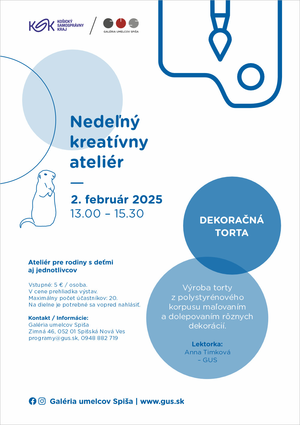 Vstupné: 5 € / osoba. Rôzne techniky a témy k aktuálnym výstavám. Lektorky: Anna Timková, Kamila Paceková – GUS.