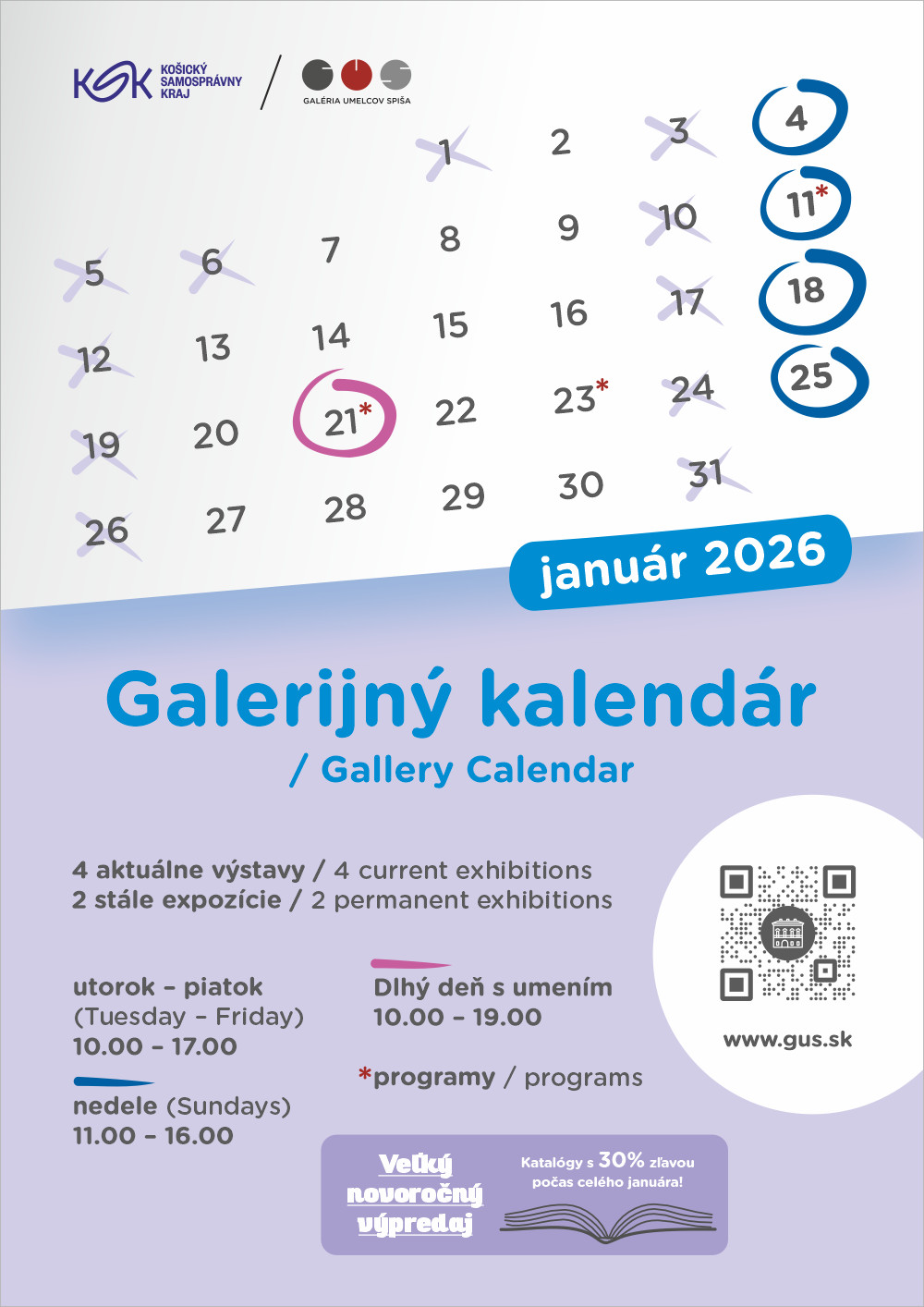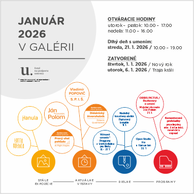 Galéria umelcov Spiša je v januári pre verejnosť otvorená: utorok – piatok, 10.00 – 17.00 a nedeľa, 11.00 –16.00. Galéria je zatvorená vo štvrtok, 1. 1. 2026 / Nový rok a v utorok, 6. 1. 2026 / Traja králi. Počas Dlhého dňa s umením v stredu, 21. 1. 2026 je galéria otvorená od 10.00 do 19.00.
