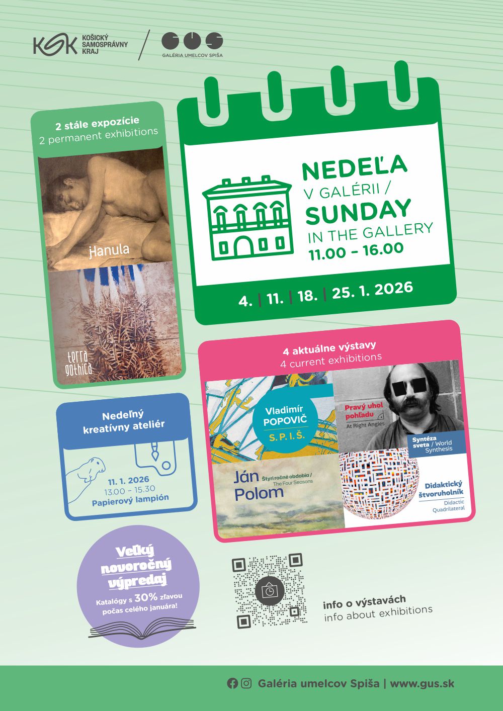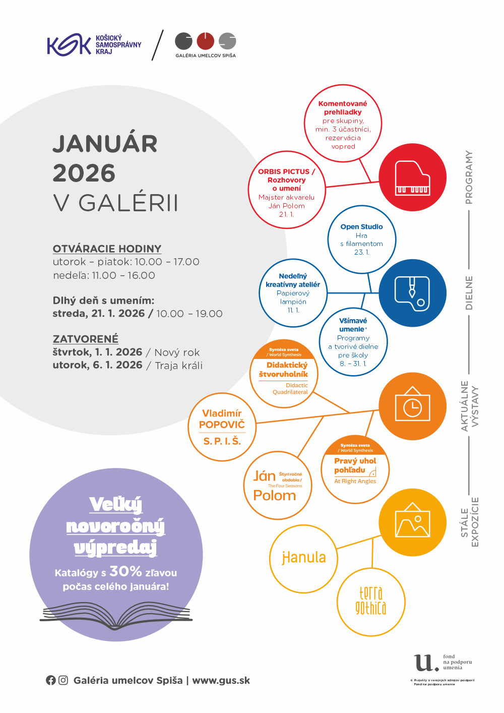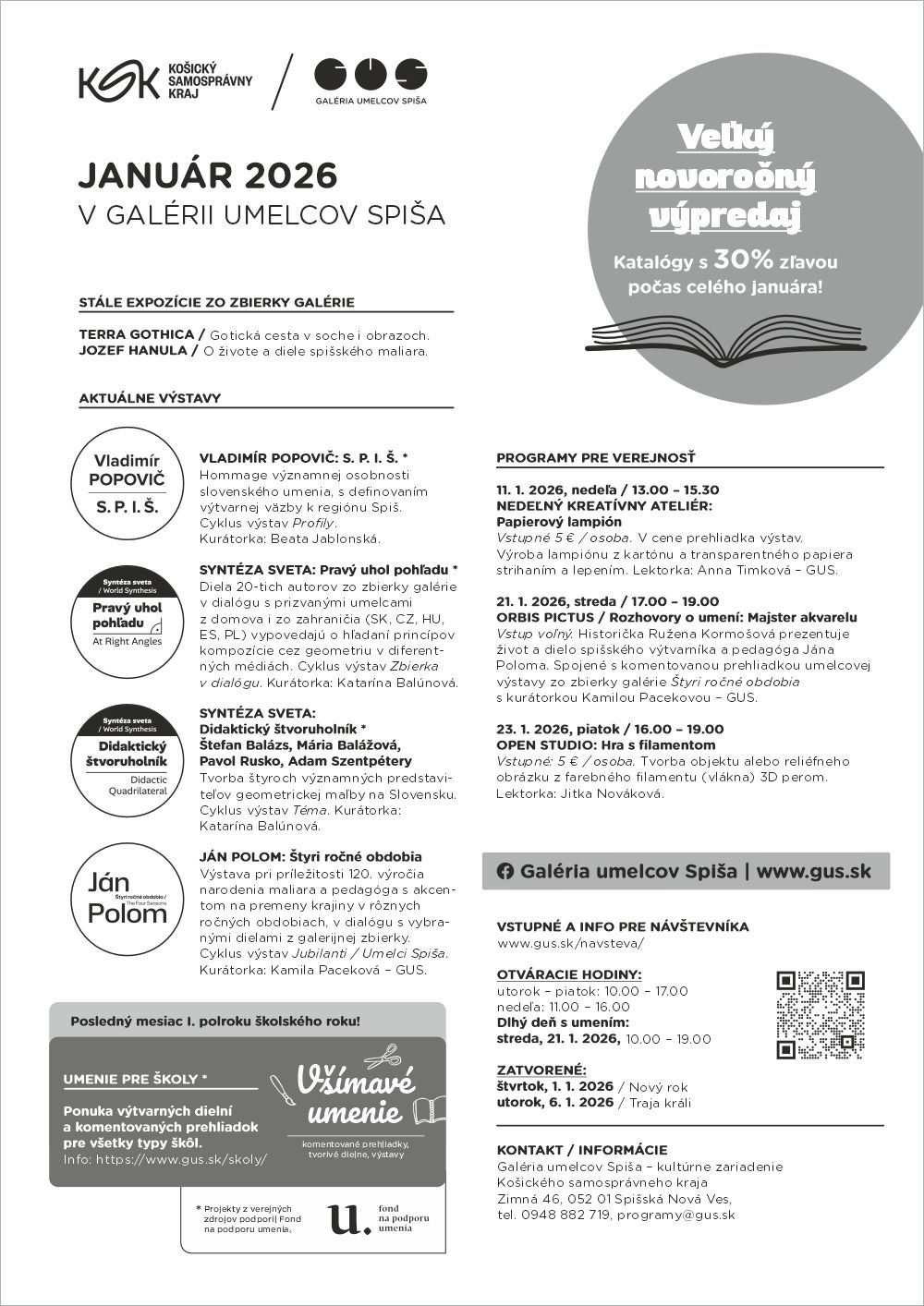 Galéria umelcov Spiša, kultúrne zariadenie Košického samosprávneho kraja, odštartuje nový rok 2026 veľkým novoročným výpredajom a kvalitnou ponukou výstav a programovou dramaturgiou orientovanou pre široké spektrum návštevníkov. Druhá januárová nedeľa bude už tradične patriť obľúbenému programu pre rodiny s deťmi s názvom Nedeľný kreatívny ateliér. V rámci projektu Orbis Pictus / Rozhovory o umení odprezentuje historička Ružena Kormošová život a dielo spišského výtvarníka a pedagóga Jána Poloma. Podujatie bude spojené s komentovanou prehliadkou výstavy Štyri ročné obdobia s kurátorkou Kamilou Pacekovou. Dielňa určená pre každého – Open Studio, pod lektorským vedením Jitky Novákovej bude zameraná na tvorbu objektu z farebného filamentu 3D perom.