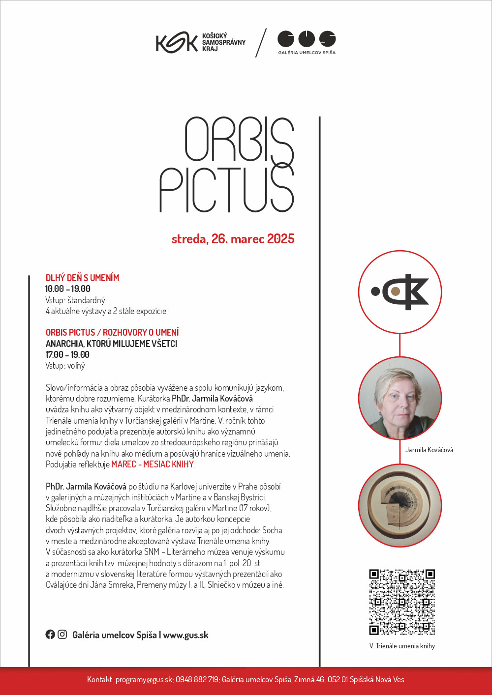 Vstup voľný. Podujatie reflektujúce MAREC – MESIAC KNIHY. Slovo/informácia a obraz pôsobia vyvážene a spolu komunikujú jazykom, ktorému dobre rozumieme. Kurátorka PhDr. Jarmila Kováčová uvádza knihu ako výtvarný objekt v medzinárodnom kontexte, v rámci V. Trienále umenia knihy v Turčianskej galérii v Martine.