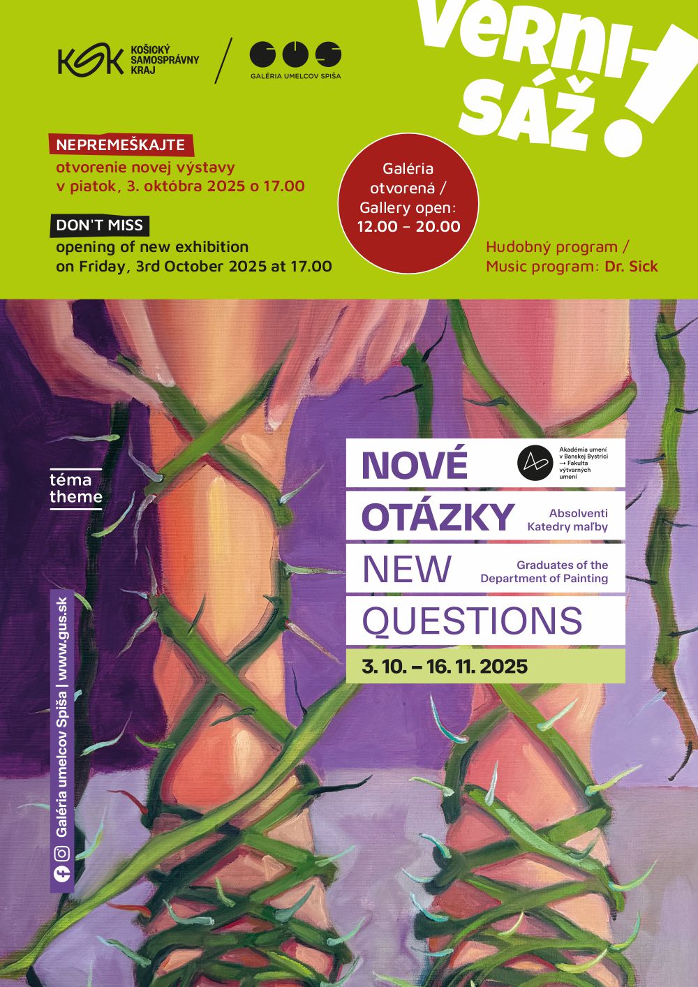 3. 10. 2025, piatok / 17.00 – 20.00 | NOVÉ OTÁZKY / Vernisáž výstavy. Hudobný program: Dr. Sick. Vstup voľný.