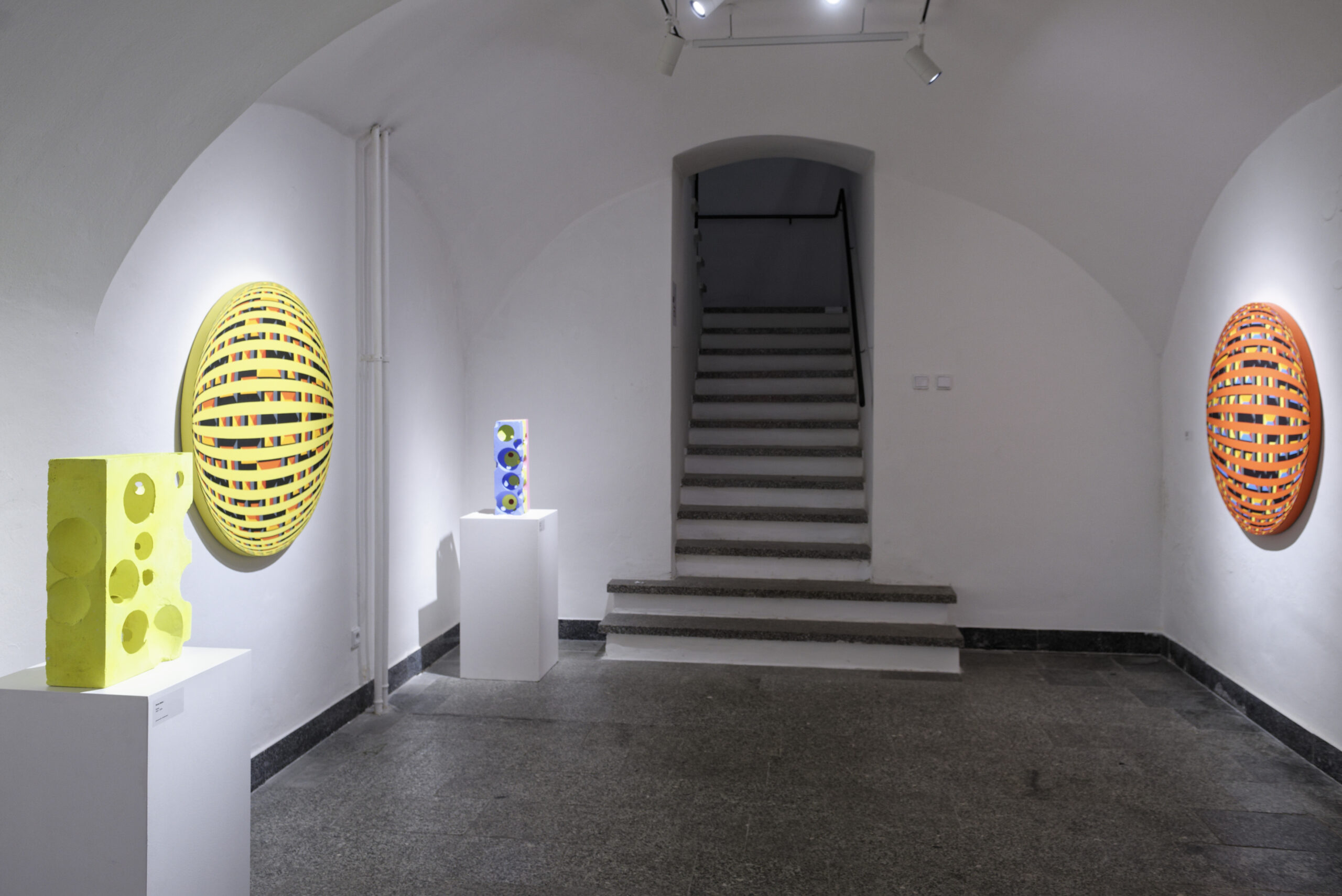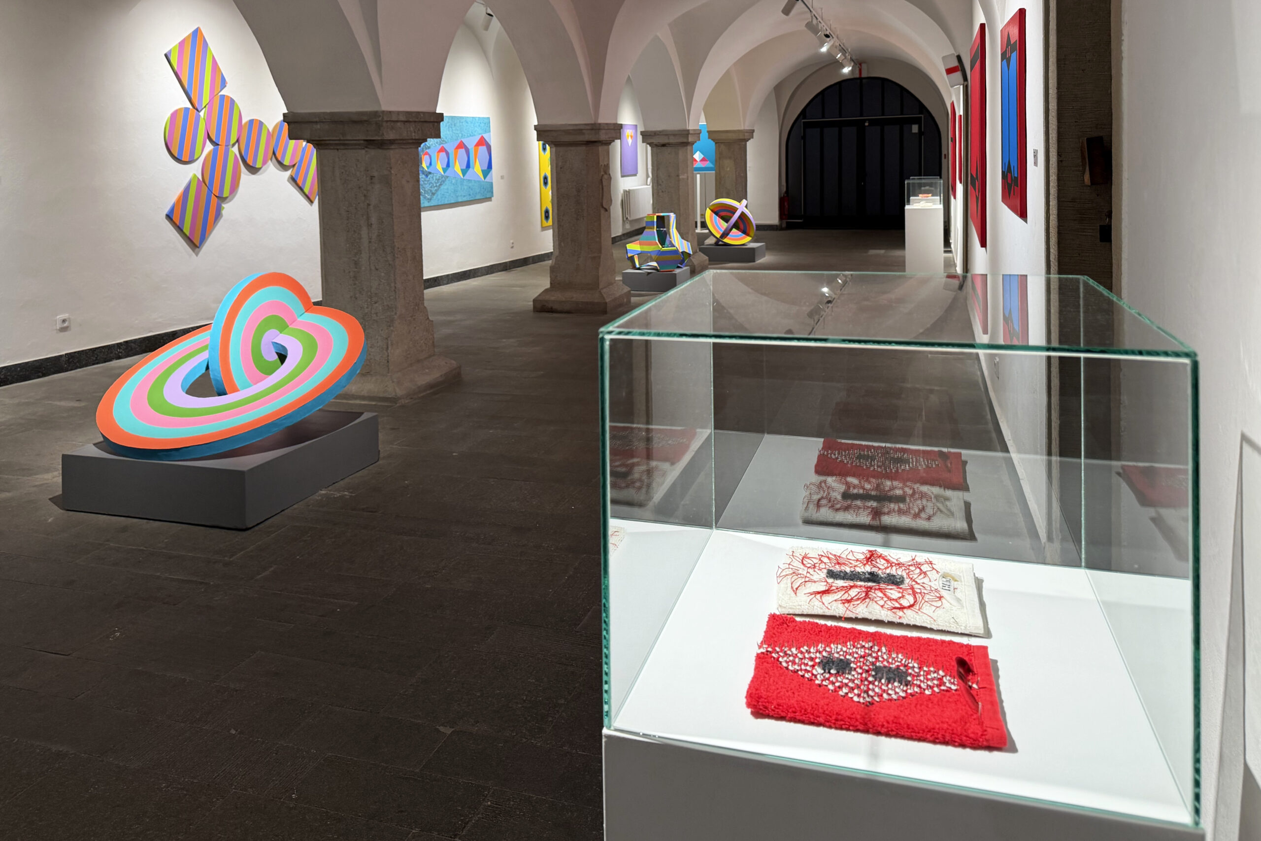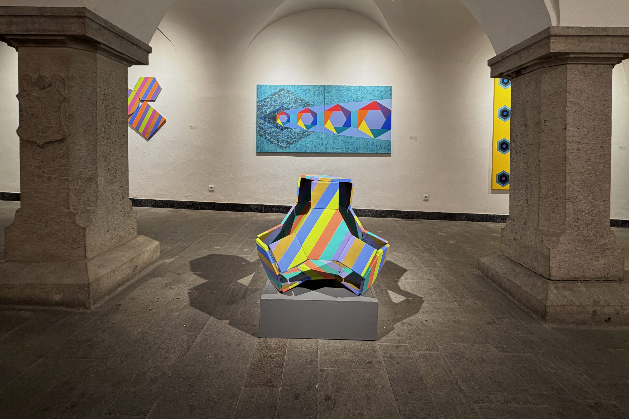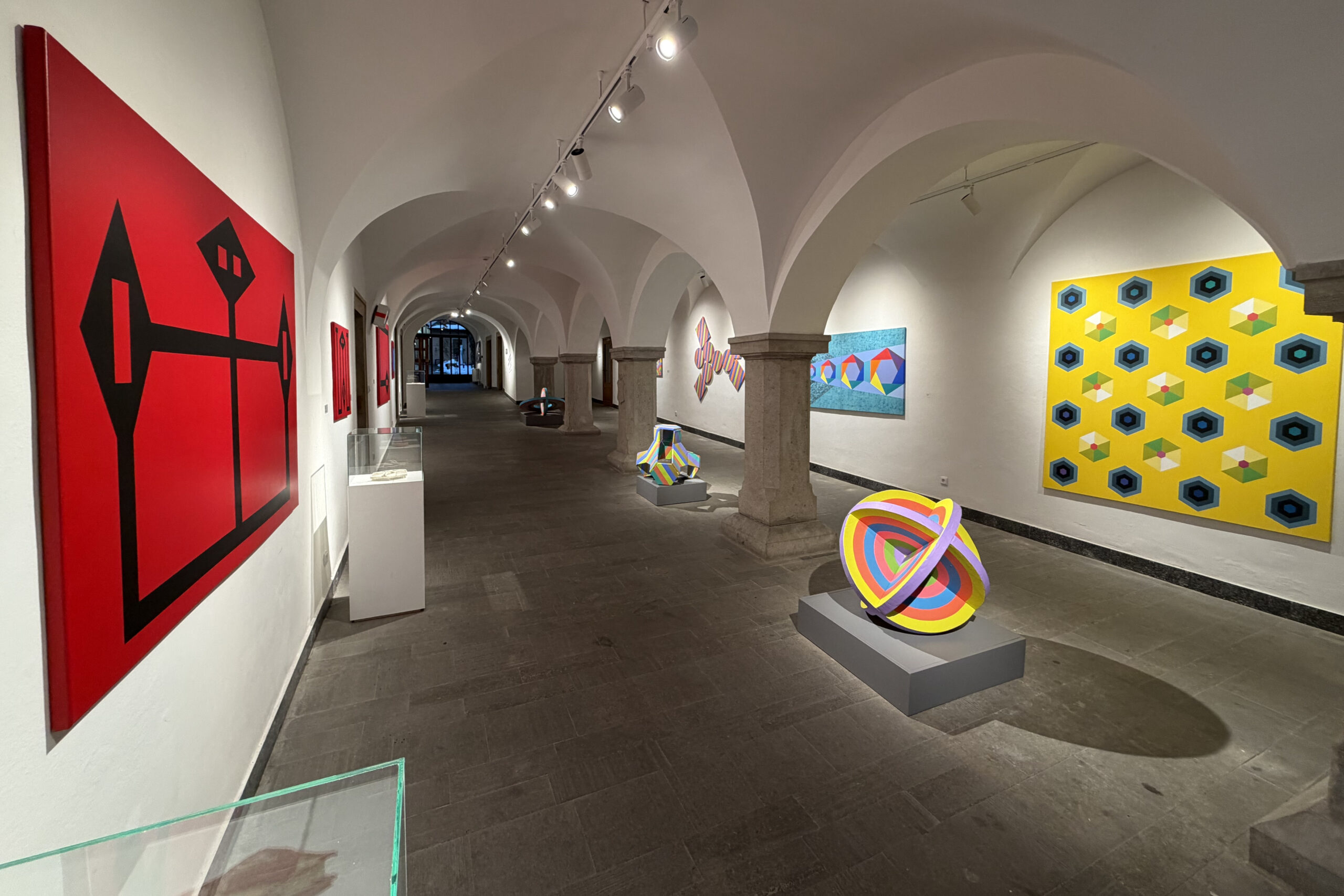 Vystavujúci autori reprezentujú individuálne cesty geometrickej expresie, ktorých odlišnosti sa prelínajú s podobnými východiskami a spoločným vzťahom ku geometrickým princípom. Tvorba Štefana Balázsa vychádza z presvedčenia o geometrii ako základnom princípe organizácie sveta. Jeho práce reflektujú odkazy modernizmu aj súčasnej abstrakcie, kde geometria slúži ako štrukturálny rámec pre skúmanie časových a priestorových dimenzií. Balázs redukuje geometrické prvky na ich elementárnu podstatu, čím konštruuje pravidlá poriadku medzi formou a priestorom. Geometrická abstrakcia tak u neho nie je len formálnou hrou, ale odhaľovaním hlbokých štruktúr reality, nadväzujúc na filozofiu univerzálneho vizuálneho jazyka. Mária Balážová rozvíja geometrickú abstrakciu ako metaforický a emocionálny priestor, v ktorom reflektuje osobné aj spoločenské otázky týkajúce sa žien, práce a identity. Geometrické tvary v jej prevedení sa stávajú symbolickým gestom kritizujúcim rodovú nerovnosť a patriarchálne štruktúry. Jej tvorba stavia na postgeometrickej maľbe, prepojenej s fenomenologickou skúsenosťou priestoru a tela, čím vytvára napätie medzi pevnou štruktúrou a dynamikou individuálnej percepcie. Dlhodobo pracuje na cykle Hadia geometria, ktorý priniesol do slovenskej maľby fenomén sémantickej geometrie. Pavol Rusko vnáša do geometrického systému prvky rytmu a scitlivenej variability, čím vytvára obrazy, ktoré evokujú pohyb a časovosť v pevne zadanom geometrickom rámci. Jeho práca osciluje medzi princípmi matematickej presnosti a poetikou organickej zmeny, čím reflektuje dynamiku súčasného sveta. V tvorbe Pavla Ruska je prvok opakovania a symetrie základným nástrojom kompozície. Opakujúce sa geometrické motívy vytvárajú rytmický efekt, kým symetrické usporiadanie dodáva dielam rovnováhu a odkazuje na metafyzické princípy. Adam Szentpétery využíva precíznu líniu a sofistikovanú farebnú harmóniu ako nástroj syntézy formy a významu, čím dotvára kontinuum modernistických i súčasných tendencií geometrickej maľby a op artu. Vo svojej tvorbe buduje komplexné obrazové štruktúry založené na rytmickom opakovaní horizontál, vertikál a diagonál, ktoré vytvárajú napätie a vizuálnu frekvenciu. Monumentálne kruhy ako ilúzie 3D priestoru reflektujú prelínanie tradičných princípov s modernými technológiami. Szentpétery kombinuje matematickú logiku s emocionálnou rezonanciou vytvárajúc vizuálnu poetiku nadčasovosti.