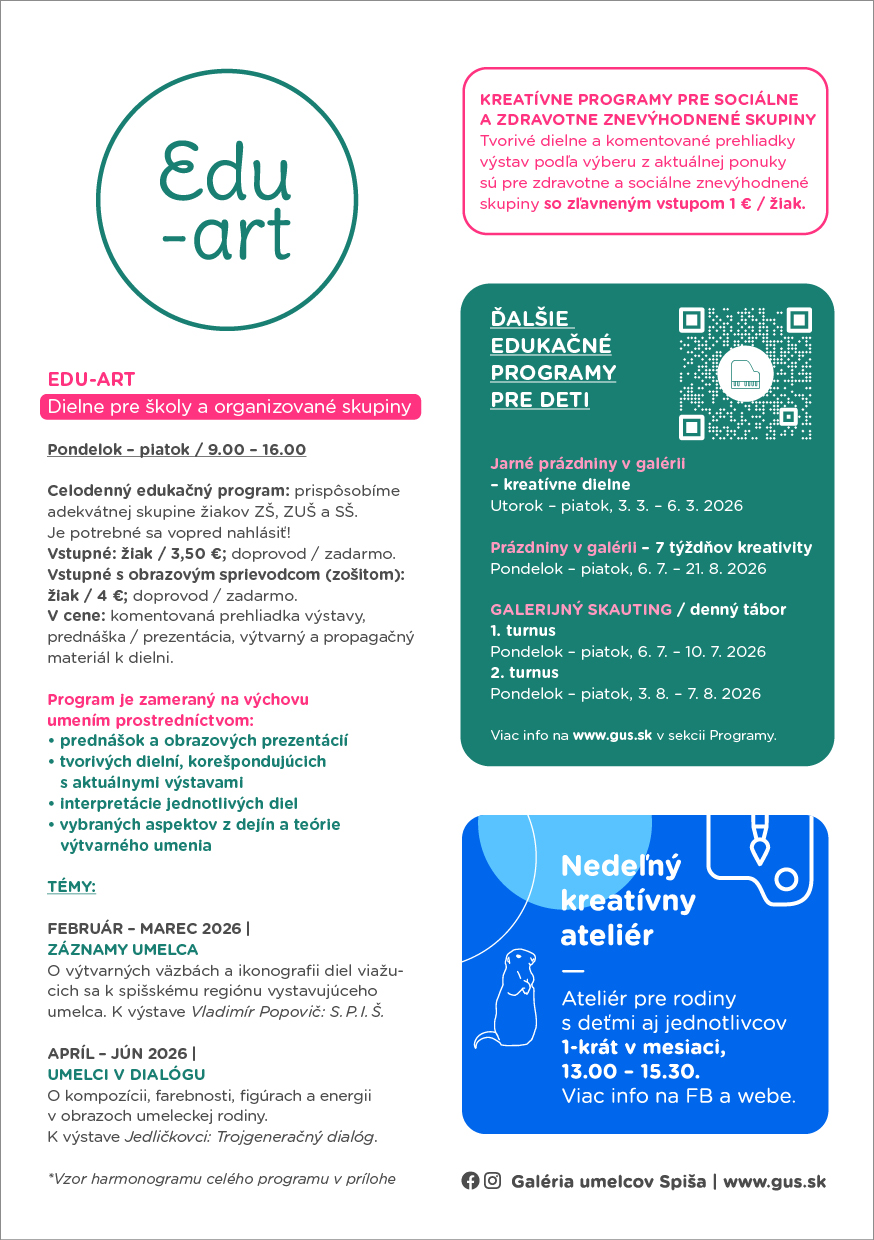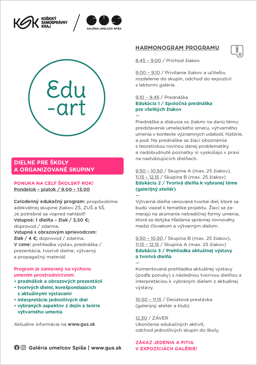 Vstupné: žiak / 2 €; doprovod / zdarma; v cene prehliadka výstavy a výtvarný materiál.